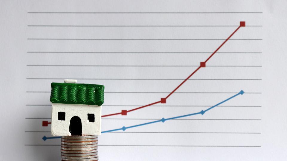 A miniature house on a pile of coins in front of a linear graph. The concept of a relationship … [+]